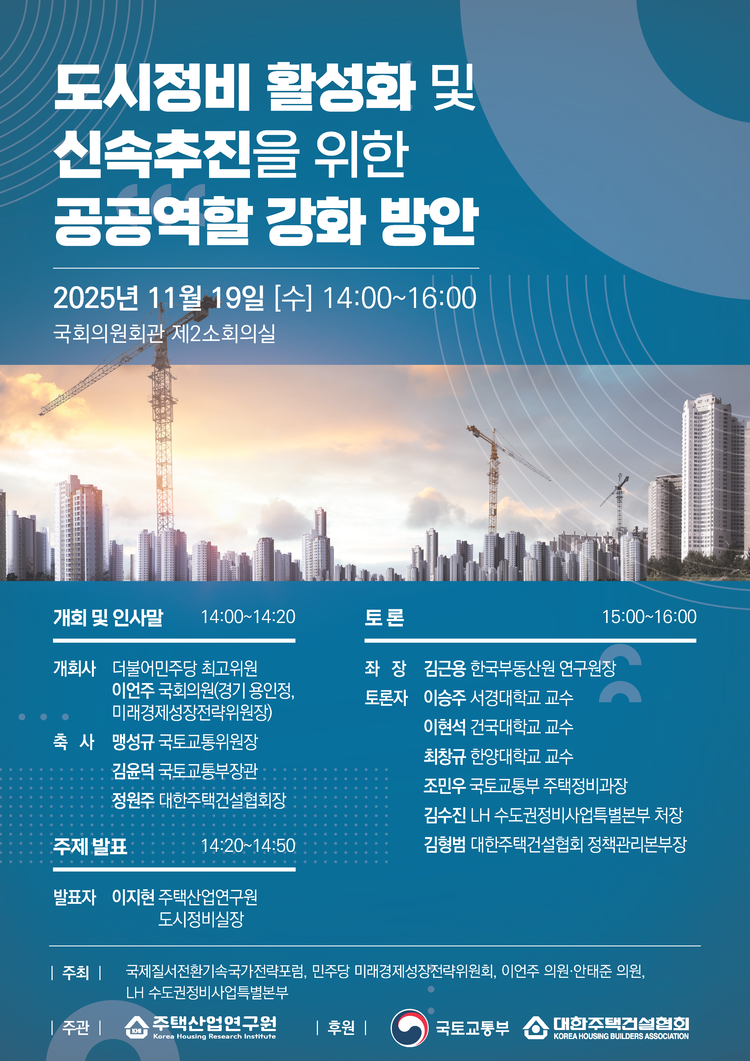 토론자로는 이승주 서경대학교 교수, 이현석 건국대학교 교수, 최창규 한양대학교 교수 등 학계 전문가와 조민우 국토교통부 주택정비과장, 김수진 LH 수도권정비사업특별본부 처장, 김형범 대한주택건설협회 정책관리본부장 등 정부·공공·업계 관계자가 참여해 실효성 있는 대안을 논의한다.
