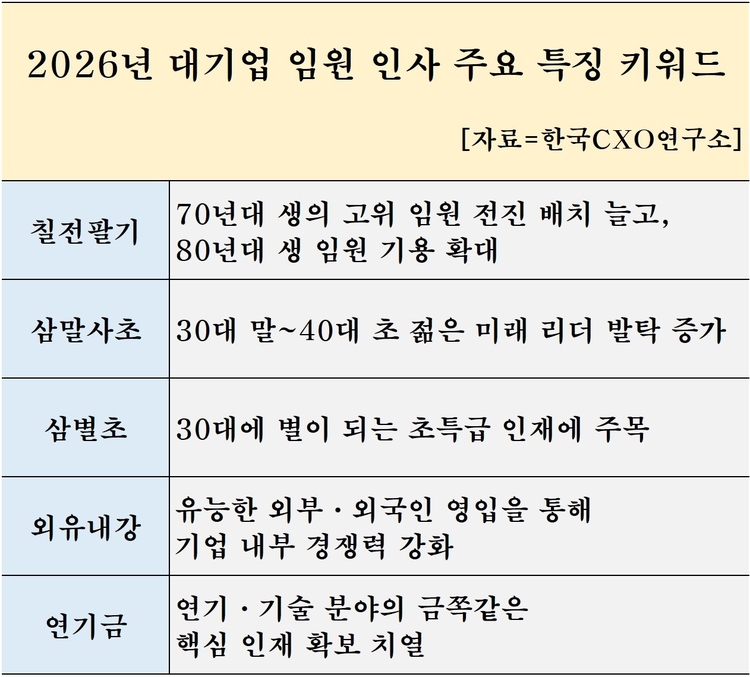 오일선 한국CXO연구소 소장은 "발탁과 승진을 포함해 2026년 대기업 임원 인사 폭은 이전해보다 감소하고, 경영 효율성 차원에서 전체적인 임원 자리도 줄어들 수 있다"면서도 "다양성 강화 차원에서 여성 임원은 더 늘리고, 안전과 환경을 포함해 ESG 관련 임원 자리는 예전보다 더 많이 늘어날 수 있다"고 말했다.
