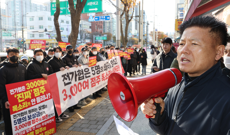 더본코리아 가맹점주들은 19일 서울 서초구 전국가맹점주협의회 앞에서 전가협의 사실 왜곡 및 여론몰이 중단 촉구 기자회견을 열고 "전가협이 일부 점주 5명의 주장만을 근거로 3천여 명 전체가 본사와 갈등을 겪는 것처럼 왜곡하고 있다"고 밝혔다.