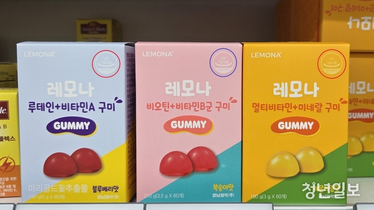 해당 제품 외에도 건기식 인증마크 틀은 유지하되, 그림과 글자의 색상을 저마다 바꿔 표시하는 제품들이 많았고, 각 제품 배경 색상 효과에 의해 어떤 제품은 비교적 ‘건강기능식품’ 글자가 잘 보이지만 어떤 제품은 ‘건강기능식품’ 글자가 잘 보이지 않았다.