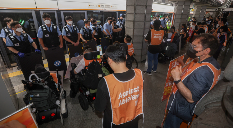 이에 대해 공사는 "휠체어에 탑승한 채 특정 열차 출입문에 모여 탑승하거나, 열차 출입문 사이에 휠체어를 정지시키는 등 고의로 열차를 지연시키는 불법행위"라고 주장했다.