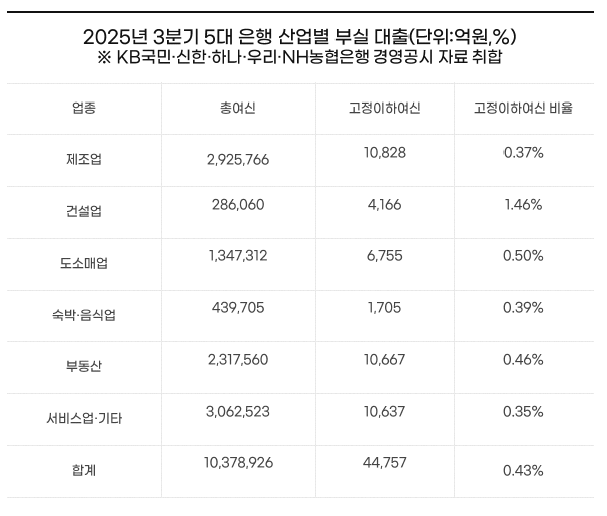 특히 제조업과 비교하면 건설업의 부실 대출 비율은 약 4배나 높다.