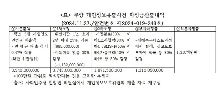 3일 국회 정무위원회 소속 사회민주당 한창민 의원실이 개인정보위 제출 자료 등에 따르면, 당시 과징금 산정 기준금액은 약 39억4천만원이었으나, 이후 조정·감경 절차를 거치며 최종 부과액은 13억1천만원으로 줄어든 것으로 나타났다.