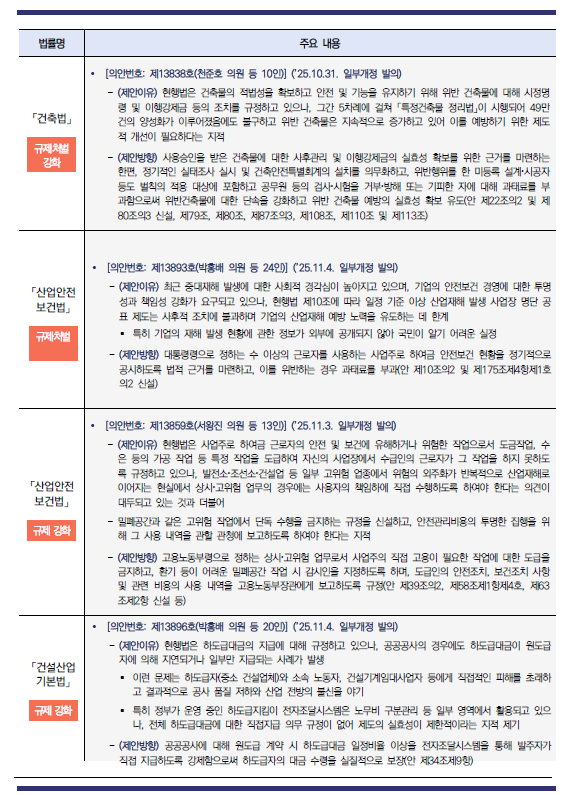 이 중 건설안전 관련 법안이 29건에 달했으며, 특히 '산업안전보건법' 개정안이 18건으로 전체의 약 30%를 차지하는 등 규제와 처벌 강화 중심의 입법 경향이 뚜렷했다.