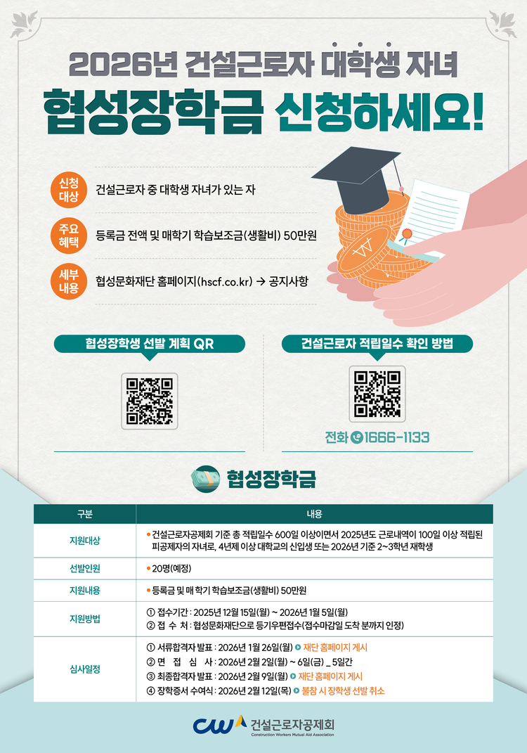 건설근로자공제회는 협성문화재단과 함께 '2026년 신규 협성장학생'을 선발한다고 8일 밝혔다.