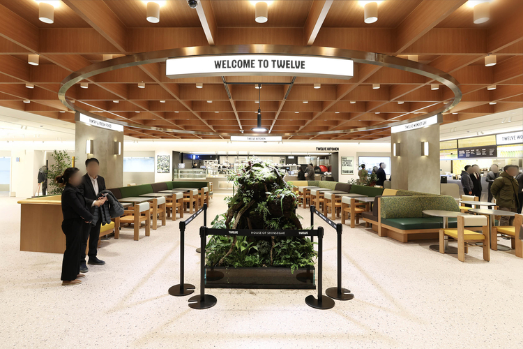 트웰브의 입구에는 ‘아고라(Agora)’라 불리는 넓은 광장이 가장 먼저 펼쳐진다. 공용 테이블과 100여석 규모의 좌석을 배치해 도심 속 라운지처럼 편안하게 머물 수 있도록 구성했다. 인접한 델리와 스무디바까지 자연스럽게 이어지는 동선으로, 먹고 쉬고 쇼핑하는 모든 경험이 하나의 흐름으로 연결된다.