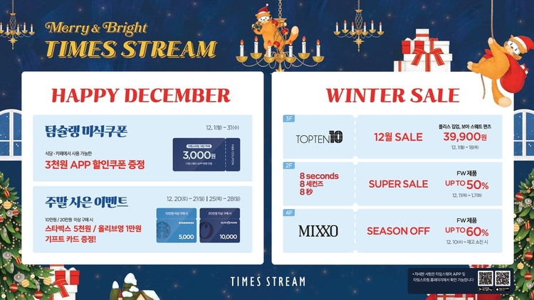 먼저 12월 내내 입점 F&B 매장에서 할인 받을 수 있는 ‘탐슐랭 미식 쿠폰 이벤트’를 진행한다. 타임스퀘어 APP 회원 대상으로 타임스트림 내 식당 및 카페에서 1만2천원 이상 구매 시 사용할 수 있는 3천원 할인 쿠폰이 제공된다. 해당 쿠폰은 ‘우된장’, ‘담솥’, ‘카레마치’, ‘스시노칸도’, ‘해방촌 부대찌개’, ‘탕화쿵푸’, ‘트윗젤’ 등 매장에서 사용할 수 있다.