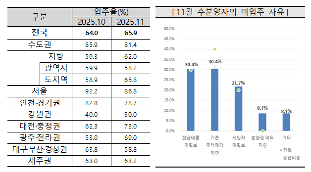 미입주 원인으로는 ‘잔금대출 미확보’와 ‘기존 주택 매각 지연’이 각각 30.4%로 가장 높았으며, ‘세입자 미확보’(21.7%)가 그 뒤를 이었다.