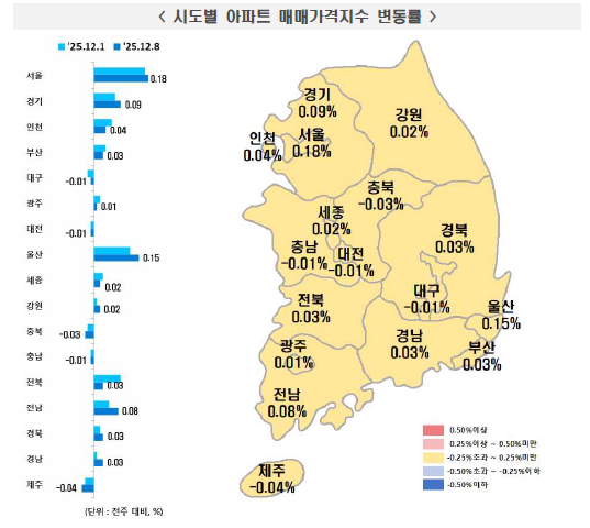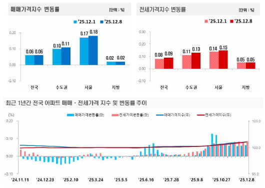 한국부동산원이 11일 발표한 2025년 12월 2주(8일 기준) 전국 주간 아파트 가격 동향에 따르면, 전국 아파트 매매가격은 0.06% 상승하며 지난주 상승폭을 유지했다.