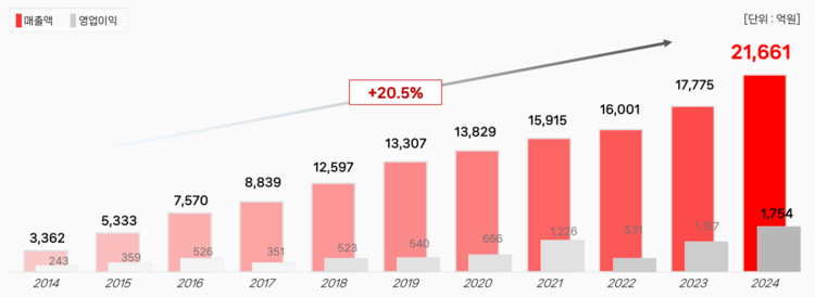코스맥스는 최근 10년간 꾸준한 성장세를 이어왔다. 지난 2014년 매출 3천362억원에서 지난해 2조1천661억원으로 성장했으며, 영업이익률 역시 2017년 4%에서 지난해 8.1%로 개선됐다. 회사는 향후에도 연평균 8% 수준의 영업이익률을 유지하며 수익성을 더욱 높인다는 방침이다.