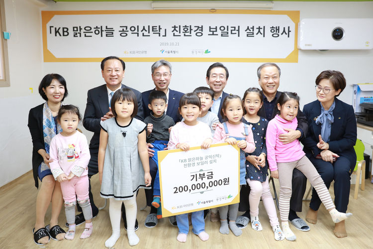 'KB 맑은하늘 공익신탁' 상품 가입 고객의 자발적인 참여로 모아진 1억원과 은행도 동일한 금액을 기부하는 매칭그랜트 방식으로 조성된 1억원 등 총 2억원의 기부금은 서울시가 선정한 사회복지시설 150곳의 노후보일러를 환경부 환경마크 인증을 받은 친환경콘덴싱보일러로 교체하는 사업에 사용될 예정이다.