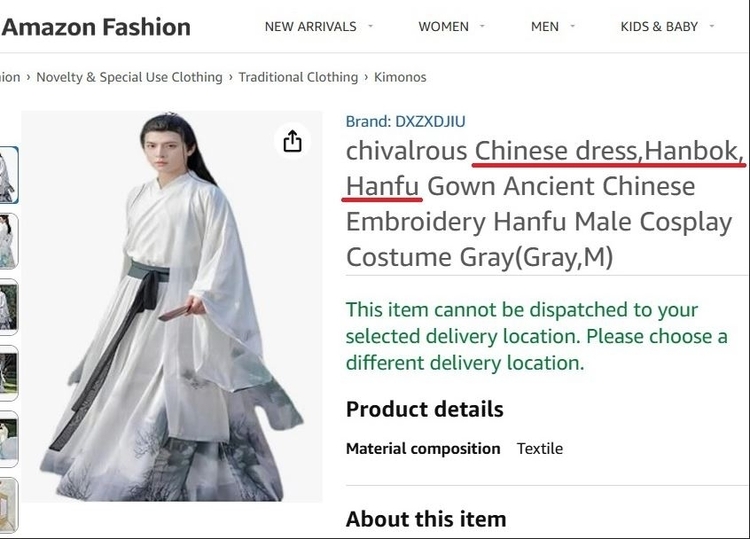 【 청년일보 】 글로벌 전자상거래 플랫폼 아마존에서 중국 업체로 추정되는 판매자들이 중국 전통의상을 뜻하는 '한푸'(漢服)를 '한복'으로 표기해 판매해 논란이 확산하고 있다.