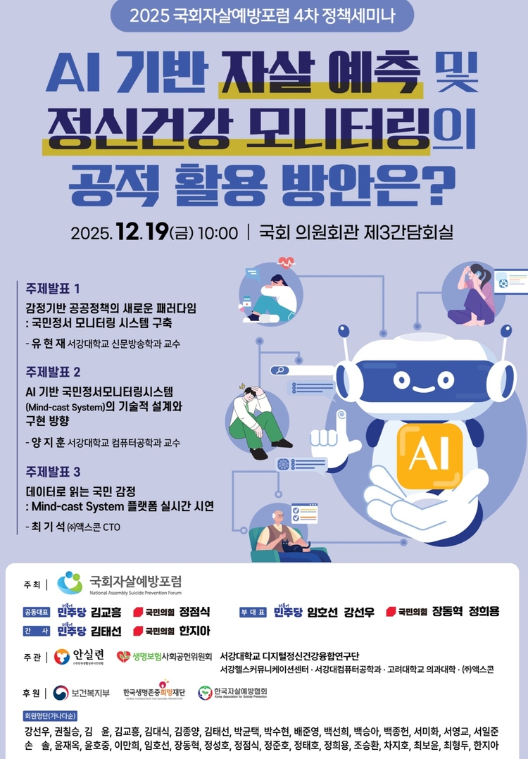 양 기관은 19일 오전 10시 국회의원회관 제3간담회의실에서 'AI 기반 자살 예측 및 정신건강 모니터링의 공적 활용 방안은?'이라는 주제로 '2025 국회자살예방포럼 4차 정책 세미나'를 개최한다고 밝혔다.