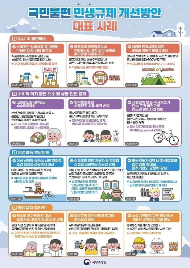 또 예비군 훈련 연기 사유를 입사 예정일·배우자 출산·난임 치료 등으로 확대하고, 저소득 국가유공자의 요양 지원 대상자 안내·신청 서비스도 강화한다. 어선 선복량(총톤수) 상한 완화, 산림복원 관련 기술자·전문업 신설 등도 추진한다.
