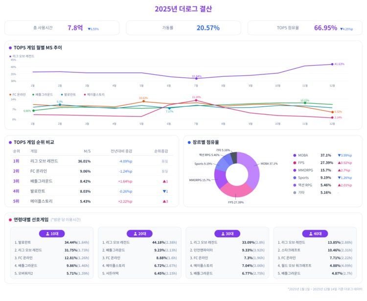 올해는 MMORPG와 액션 RPG 장르의 성장이 돋보였다. '던전앤파이터(4.29%)'는 전년 대비 점유율이 2.51%p 상승하며 가장 큰 성장 폭을 기록했고, '메이플스토리(5.43%)' 역시 2.22%p 오르며 강세를 보였다. MMORPG 장르 전체 점유율은 전년 대비 2.70%p 상승하며 전년 대비 3.99%p 감소한 MOBA 장르의 감소분을 흡수하는 모습을 보였다.