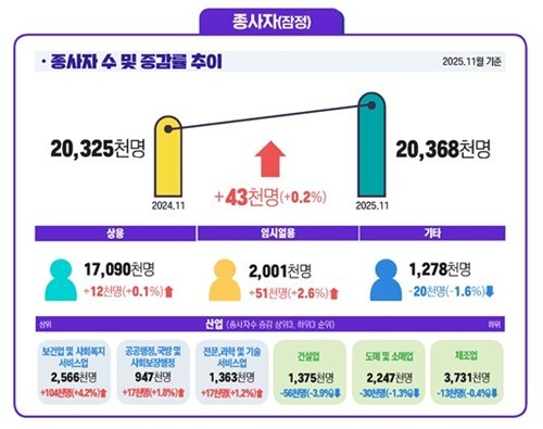 30일 고용노동부가 발표한 올해 11월 사업체 노동력조사에 따르면, 지난달 기준 1인 이상 사업체 종사자는 2천36만8천명으로 1년 전보다 4만3천명(0.2%) 증가했다.