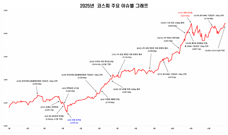 한국거래소는 “연초 코스피는 정치적 불안정성 및 미국 상호관세 우려 등 대내외 불확실성이 확대되며 연저점을 기록하기도 했으나 새정부 출범 이후 주주가치 제고, 불공정거래 근절 등 자본시장 활성화 정책 및 반도체 업황 개선 등으로 투자심리가 개선되며 상승세로 전환했다”고 밝혔다.