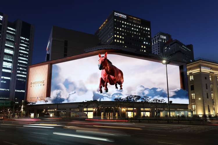이번 미디어아트는 천마도에서 영감을 얻어 구름 사이로 말이 등장해 힘차게 달리는 모습을 담았으며, 입체감과 현장감을 표현하는 아나몰픽 기법을 적극 활용해 몰입도를 높였다.