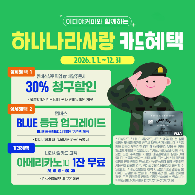 이번 제휴를 통해 하나은행 나라사랑카드 발급 고객은 이디야멤버십 애플리케이션 내 이디야페이에 카드를 등록하면 '이디야멤버스' BLUE 등급으로 업그레이드된다. 또한 이디야멤버스 앱을 통한 픽업/배달 주문 시 청구 할인 혜택이 제공되며, 올해 6월까지 카드를 발급한 고객에 한해 아메리카노(L) 1잔 무료 쿠폰도 증정된다.
