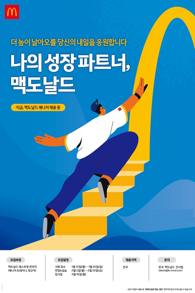 채용 절차는 서류 접수 후 1차 인터뷰, 2차 매장 실습을 거쳐 최종 합격자를 발표하는 순서로 진행된다. 서류 접수 기간은 오는 12일부터 25일까지이며, 맥도날드 공식 채용 홈페이지에서 지원 가능하다. 최종 합격자는 3월에 입사하게 된다.