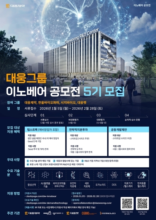 【 청년일보 】 대웅제약이 오는 2월 28일까지 제약·바이오 및 헬스케어 분야 유망 스타트업 발굴과 동반 성장을 위한 이노베어 공모전을 진행한다.