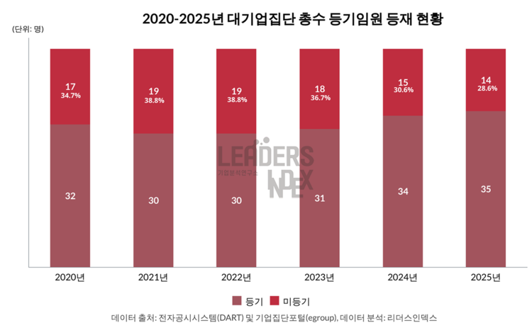 리더스인덱스는 "총수의 등기임원 등재 여부는 책임경영의 상징으로 여겨져 왔다"면서도 "등기임원 과다 겸직은 의결권 판단에 일정 부분 영향을 미칠 수 있다는 문제의식이 있다"고 분석했다.