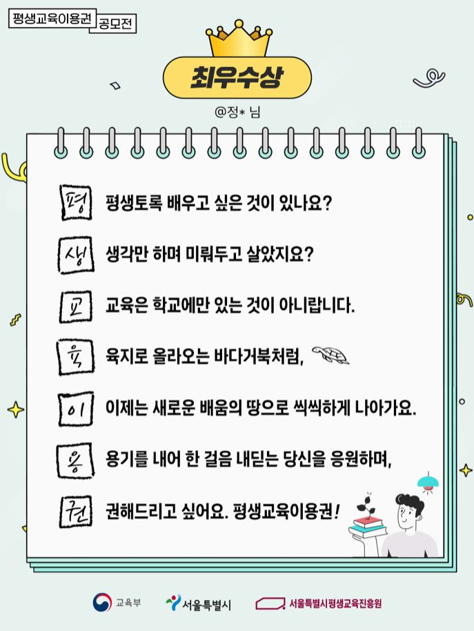 서울시는 이 같은 성과를 공유하고 확산하기 위해 지난해 11월 개최한 '2025 서울시 평생교육이용권 공모전'의 수상작을 담은 수기집을 발간했다.