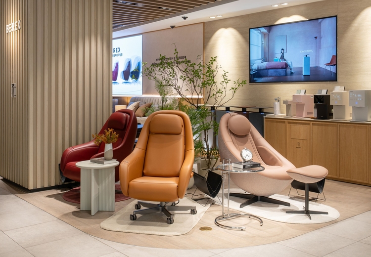 특히 국내외 디자인 어워드를 석권하며 우수성을 인정받은 '비렉스 트리플체어'도 전시돼 있다. 업무·휴식·안마의 3가지 기능을 하나에 담은 다기능 체어로, 심미성과 실용성을 동시에 갖춘 것이 특징이다. 부드러운 곡선의 세련된 디자인과 잉크 블랙, 토프 베이지 등 5가지 고급스러운 컬러는 다양한 실내 인테리어와 자연스럽게 조화를 이룬다.