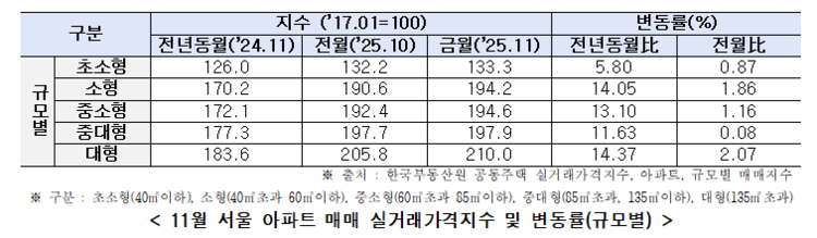 권역별로는 종로·중·용산구가 포함된 도심권이 전월 대비 3.46% 올라 서울 전체 상승세를 이끌었다. 서초·강남·송파·강동 등 동남권도 1.82% 상승했다. 면적별로는 전용면적 135㎡를 초과하는 대형 평형이 2.07% 오르며 가장 큰 상승 폭을 기록했다.