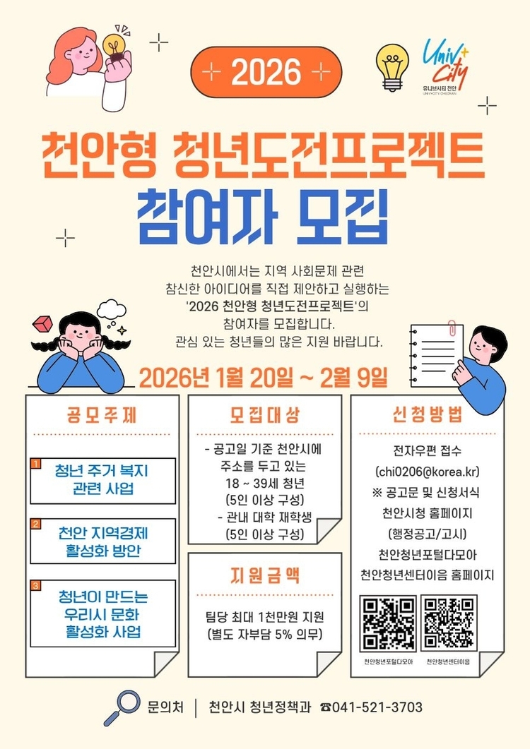 참여 희망자는 신청서와 사업제안서, 사업비 집행계획서 등을 담당자 전자우편으로 제출해야 한다. 신청 서식과 세부 사항은 천안시 또는 천안청년포털 다모아·천안청년센터 이음 누리집에서 확인할 수 있다.