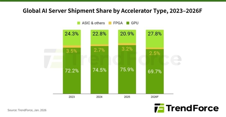 특히 올해 전체 AI 서버 출하량 가운데 엔비디아의 GB300(블랙웰) 등 GPU를 적용한 AI 서버가 69.7%를 차지하고, ASIC 기반 AI 서버 출하 비중은 2023년 이후 최고 수준인 27.8%에 이를 것이라는 관측이다.