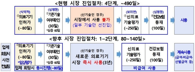 이에 복지부와 식약처는 협업을 통해 의료기기 허가 단계에서 국제적 수준의 강화된 임상평가를 거친 새로운 의료기기를 활용하는 의료기술은 별도의 신의료기술평가 없이 시장에 즉시 진입해 사용할 수 있도록 하는 제도를 마련했다.