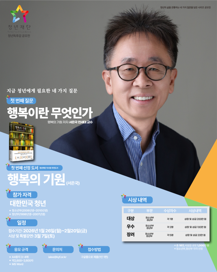 연 4회 진행되는 '청년 독후감 공모전'의 첫 번째 공모 도서로는 서은국 작가의 '행복의 기원'이 채택됐다. 해당 도서는 동시대 청년의 삶을 관통하는 질문을 중심으로, 오창석 청년재단 이사장이 직접 선정했다.
