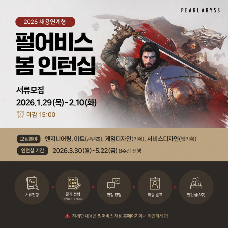 【 청년일보 】 펄어비스가 올해 채용연계형 봄 인턴십 모집을 시작한다.