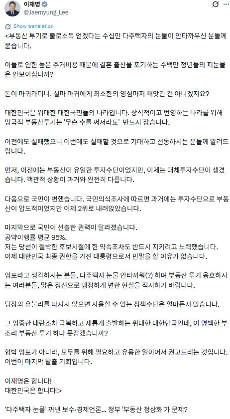 이 대통령은 "이전에도 실패했으니 이번에도 실패할 것으로 기대하고 선동하시는 분들께 알려드립니다"라며 "당장의 유불리를 따지지 않으면 사용할 수 있는 정책수단은 얼마든지 있습니다"라고 역설했다.
