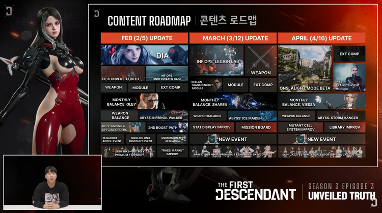 4일 게임업계에 따르면, 지난 3일 '퍼스트 디센던트' 공식 유튜브 채널을 통해 진행된 개발자 라이브 방송에서 개발진은 "시즌3 에피소드3가 오는 5일 적용되며, 이후 3월 12일과 4월 16일에도 월간 업데이트가 이어진다"고 밝혔다. 특히 4월에는 '온슬로트 모드' 베타가 도입되는 등 다양한 신규 게임 모드가 순차적으로 추가될 예정이다.