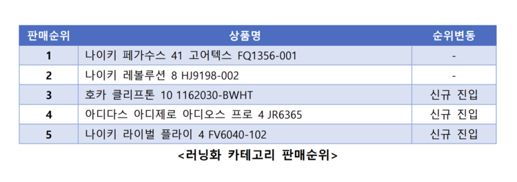 겨울 한파와 잦은 눈, 비의 영향으로 방수 및 방풍 기능을 갖춘 고어텍스 러닝화가 강세를 보였으며, 동시에 개인 기록 경신을 목표로 하는 러너의 증가로 프리미엄 레이싱화가 순위권에 새롭게 진입하는 등 매출 구조가 다양화되는 특징을 보였다.