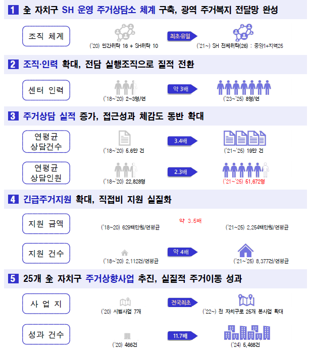 특히 주목할 만한 성과는 쪽방, 고시원, 비닐하우스 등 최저 주거 기준에 못 미치는 곳에 거주하는 시민들을 임대주택으로 이주시키는 '주거상향사업'이다.