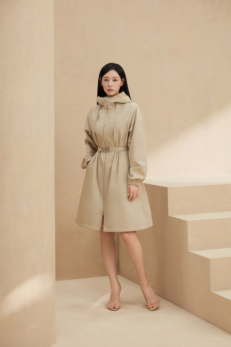 대표 아이템 '레지아'는 롱기장 바람막이 자켓으로 발수 기능성 소재를 적용했다. 금속 듀베티카 심볼 오각 버클 허리벨트로 실루엣 조절이 가능한 것이 특징이다.