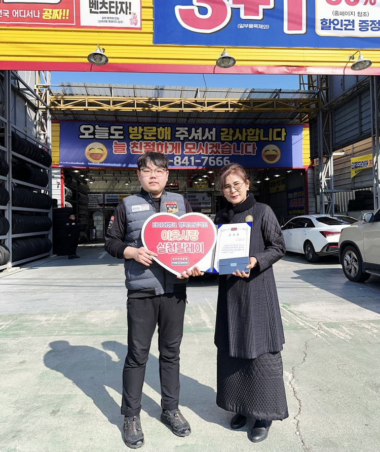 한편, '이웃사랑 실천릴레이'는 타이어뱅크가 창립 30주년이던 지난 2021년부터 진행하고 있는 사회공헌활동이다. 전국 자치단체 및 관계 기관의 추천을 받아 이웃사랑을 실천하는 단체나 개인에게 매월 감사장과 함께 타이어를 전달해 우리 사회를 위해 힘쓴 숨은 공로자를 응원하고 있다.