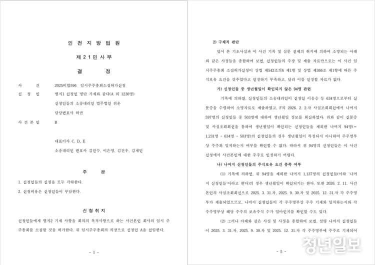 법원은 위와 같은 이유 등으로 임시주주총회 소집청구를 신청할 수 있는 신청인 적격이 소명되지 않음에 따라 신청인들의 사건 신청은 부적법하다는 결론을 내렸다고 입장을 표명했다.