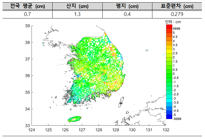 이번 조치로 전국 평균 0.7cm의 정확도가 향상됐으며, 지형별로는 산지 1.3cm, 구릉지 0.8cm, 평지 0.4cm가량 오차가 줄었다.