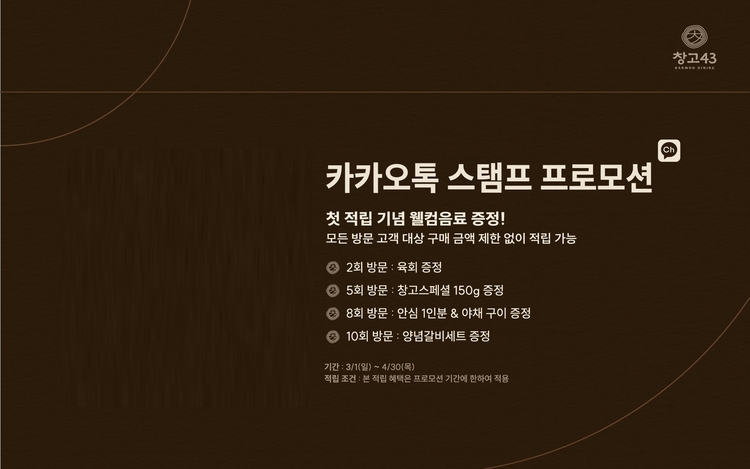 프로모션은 4월 30일까지 진행된다. 이번 프로모션의 더 많은 고객이 혜택을 누릴 수 있도록 적립 기준을 완화한 것이 특징이다. 일반적인 '테이블당 적립' 방식에서 벗어나, 식사를 마친 후 창고43 카카오톡 채널을 추가해 제시하는 모든 방문 고객 개인별로 스탬프를 지급한다.