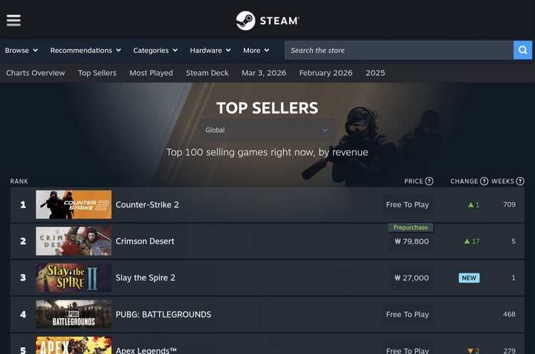 17일 게임업계에 따르면, '붉은사막'은 글로벌 PC 게임 플랫폼 스팀(Steam) 매출 순위에서 2위를 기록하고 있다.