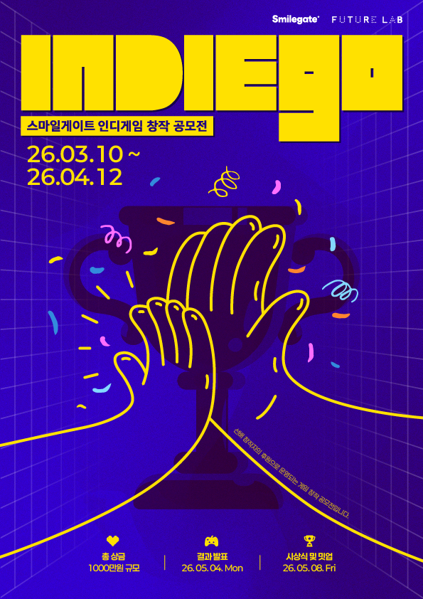 【 청년일보 】 스마일게이트 퓨처랩이 초기 인디게임 창작팀을 발굴하고 육성하기 위한 공모전 '인디고(IndieGo) 2026'의 참가 신청을 내달 12일까지 접수한다고 19일 밝혔다.