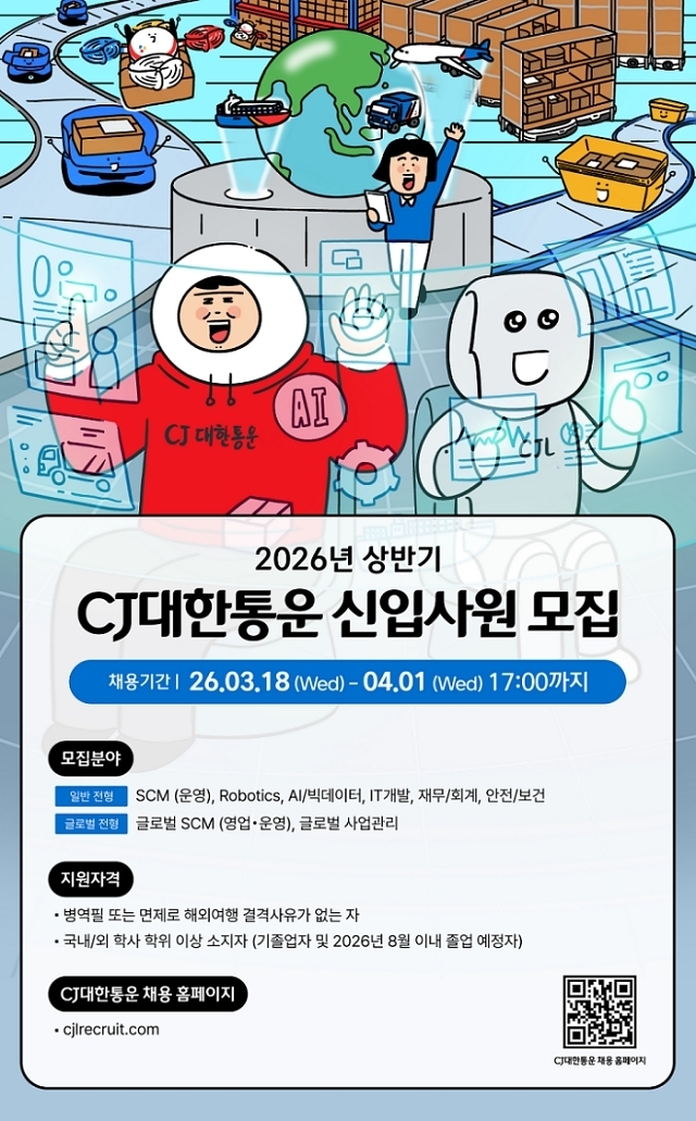 CJ대한통운이 2026년 상반기 신입사원 공채를 시작한다고 19일 밝혔다. 모집 전형은 ▲SCM ▲로보틱스 ▲AI·빅데이터 ▲IT개발 ▲재무회계 ▲안전·보건 등의 일반전형과 ▲글로벌SCM ▲글로벌 사업관리 등의 글로벌 트랙 전형으로 나누어 진행된다.
