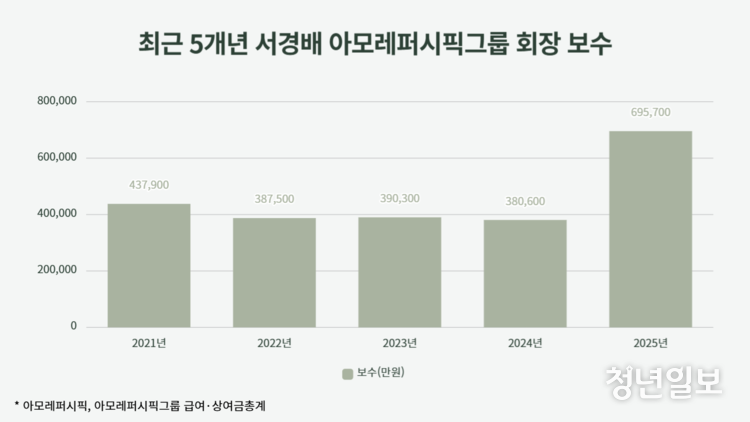 【 청년일보 】 국내 주요 뷰티 기업 최고경영자(CEO)들의 지난해 보수가 공개된 가운데, 서경배 아모레퍼시픽그룹 회장이 총 69억5천700만원으로 가장 많은 보수를 받은 것으로 나타났다.