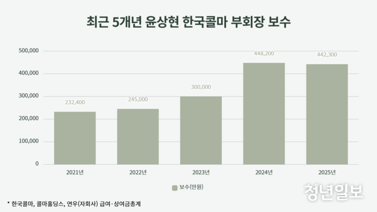 윤 부회장은 한국콜마와 콜마홀딩스 등에서 급여와 상여금을 포함해 총 44억2천300만원을 수령했다. 이는 전년(44억8천200만원) 대비 1.3% 감소한 수준이다.