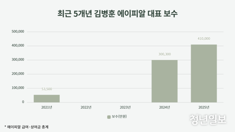 2020년 8억1천300만원, 2021년 5억3천500만원을 수령했으며, 2022년과 2023년에는 개인별 보수가 5억원 미만으로 공시 대상에 해당하지 않아 구체적인 금액이 공개되지 않았다. 이후 2024년 30억300만원, 지난해 41억원으로 급증하며 보수 규모가 크게 확대됐다.