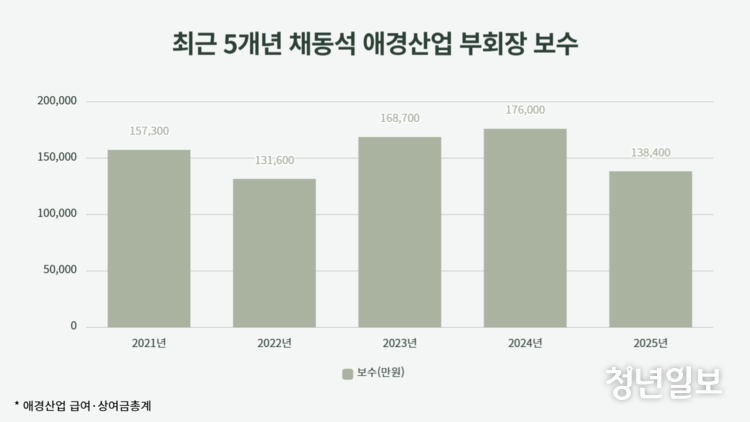 애경산업 사업보고서에 따르면 채 부회장의 보수는 급여 11억원과 상여 2억8천400만원으로 구성됐다. 이는 2024년 17억6천만원과 비교해 약 21.3% 줄어든 수준이다.